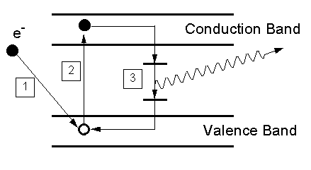 Following electron impact [1], electrons in the phosphor are excited across the band gap [2] from the valence band into the conduction band. As these excited electrons decay back to the valence band, they can pass though intermediate states [3] located within the band gap. These intermediate states are contributed by the dopant atoms. The spacing of these levels is such that the transitions produce light in the visible spectrum.