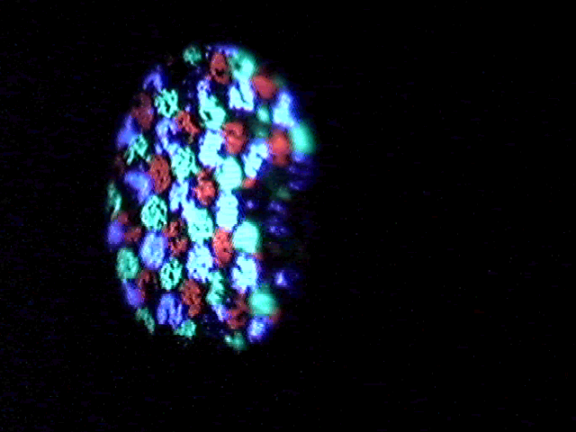 An actual visible-light photograph of the luminescence of a small group of phosphors from a computer video display unit. In this case the luminescence was excited by bombardment from 3 MeV protons.