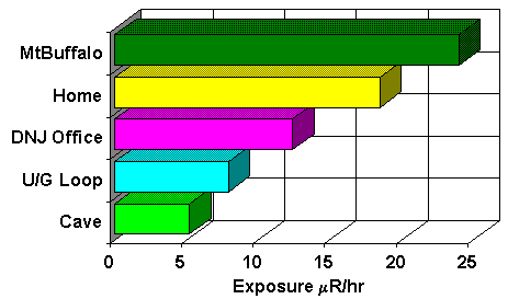 Radiation intensity (mainly from cosmic rays) on the top of the Mt Buffalo National Park, Victorian Alps, Australia. Shown by comparison are measurements in my home, office and railway station (U/G loop).